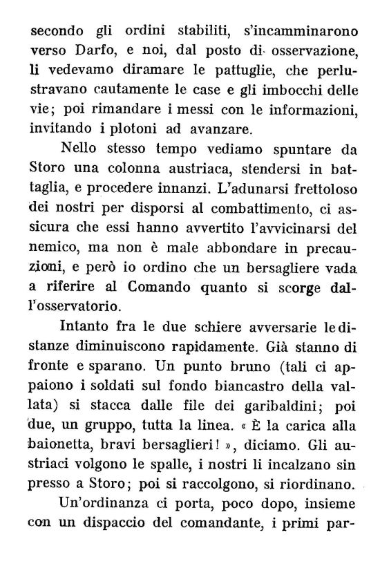 Intanto fra le due schiere avversarie le distanze diminuiscono rapidamente. Già stanno di fronte e sparano. Un punto bruno (tali ci appaiono i soldati sul fondo biancastro della vallata) si stacca dalle file dei garibaldini; poi due, un gruppo, tutta la linea. « È la carica alla baionetta, bravi bersaglieri! », diciamo. Gli austriaci volgono le spalle, i nostri li incalzano sin presso a Storo ; poi si raccolgono, si riordinano.