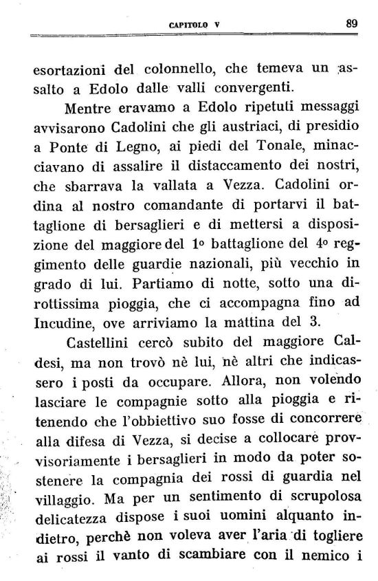 Mentre eravamo a Edolo ripetuti messaggi avvisarono Cadolini che gli austriaci, di presidio a Ponte di Legno, ai piedi del Tonale, minacciavano di assalire il distaccamento dei nostri, che sbarrava la vallata a Vezza. Cadolini ordina al nostro comandante di portarvi il battaglione di bersaglieri e di mettersi a disposizione del maggiore del 1° battaglione del 4° reggimento delle guardie nazionali, più vecchio in grado di lui. Partiamo di notte, sotto una dirottissima pioggia, che ci accompagna fino ad Incudine, ove arriviamo la mattina del 3.