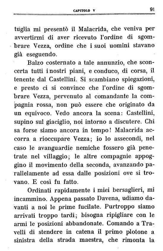 Ordinati rapidamente i miei bersaglieri, mi incammino. Appena passato Davena, udiamo davanti a noi le prime fucilate. Purtroppo siamo arrivati troppo tardi; bisogna ripigliare con le armi le posizioni abbandonate. Comando a Travelli di stendere in catena il primo plotone a sinistra della strada maestra, che rimonta la