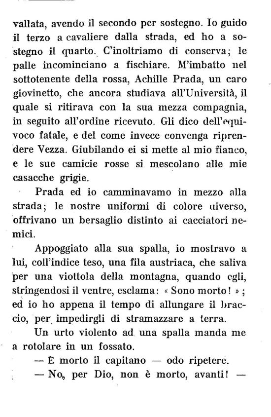 Appoggiato alla sua spalla, io mostravo a lui, coll'indice teso, una fila austriaca, che saliva per una viottola della montagna, quando egli, stringendosi il ventre, esclama: « Sono morto ! » ; ed io ho appena il tempo di allungare il braccio, per impedirgli di stramazzare a terra.