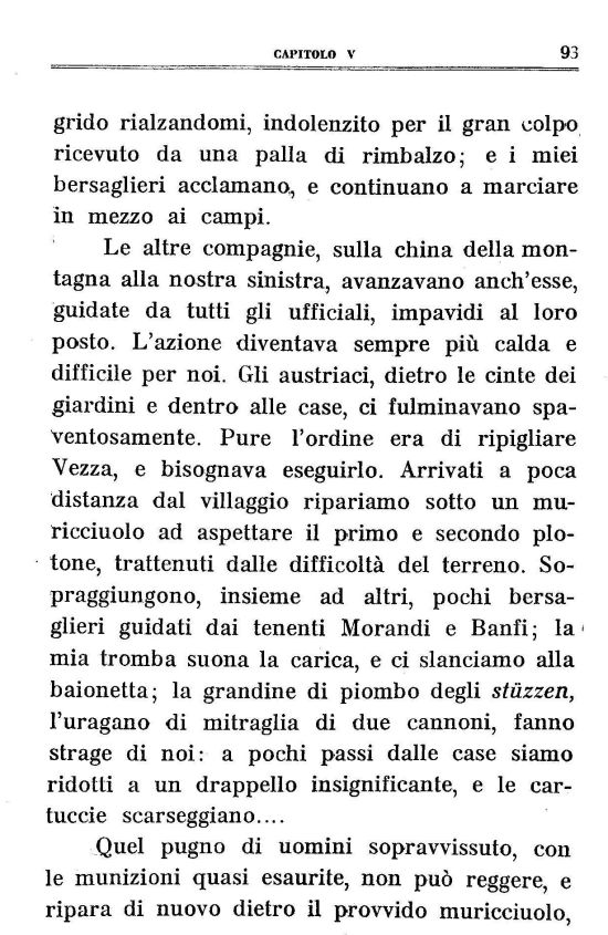 Le altre compagnie, sulla china della montagna alla nostra sinistra, avanzavano anch'esse, guidate da tutti gli ufficiali, impavidi al loro posto. L'azione diventava sempre più calda e difficile per noi. Gli austriaci, dietro le cinte dei giardini e dentro alle case, ci fulminavano spaventosamente. Pure l'ordine era di ripigliare Vezza, e bisognava eseguirlo. Arrivati a poca distanza dal villaggio ripariamo sotto un mu-ricciuolo ad aspettare il primo e secondo plotone, trattenuti dalle difficoltà del terreno. Sopraggiungono, insieme ad altri, pochi bersaglieri guidati dai tenenti Morandi e Banfi; la' mia tromba suona la carica, e ci slanciamo alla baionetta; la grandine di piombo degli stùzzen, l'uragano di mitraglia di due cannoni, fanno strage di noi: a pochi passi dalle case siamo ridotti a un drappello insignificante, e le car-tuccie scarseggian o....