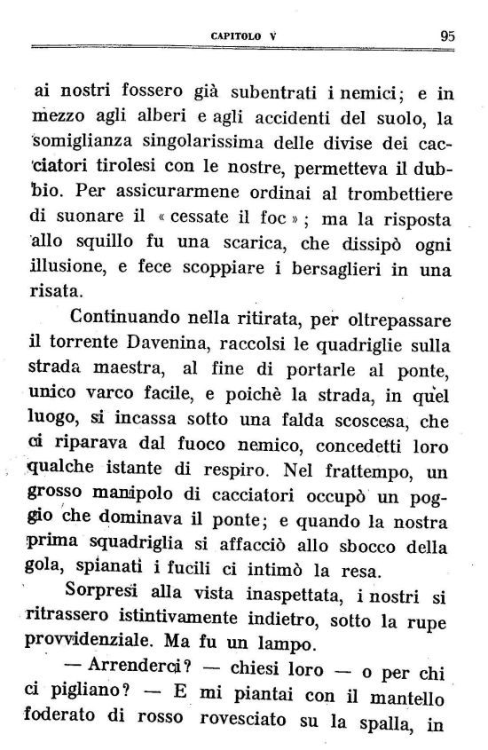 Continuando nella ritirata, per oltrepassare il torrente Davenina, raccolsi le quadriglie sulla strada maestra, al fine di portarle al ponte, unico varco facile, e poiché la strada, in quel luogo, si incassa sotto una falda scosceisa, che ed riparava dal fuoco nemico, concedetti loro qualche istante di respiro. Nel frattempo, un grosso manipolo di cacciatori occupò un poggio che dominava il ponte; e quando la nostra prima squadriglia si affacciò allo sbocco della gola, spianati i fucili ci intimò la resa.