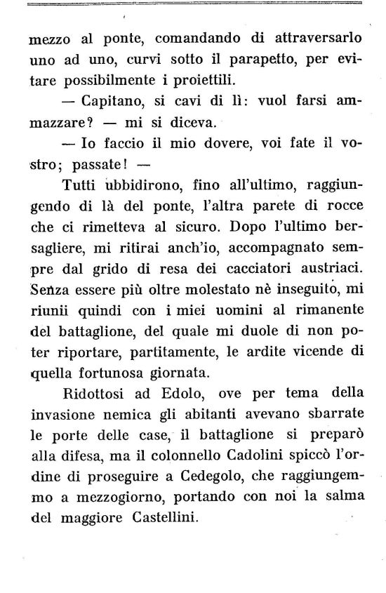 Ridottosi ad Edolo, ove per tema della invasione nemica gli abitanti avevano sbarrate le porte delle case, il battaglione si preparò alla difesa, ma il colonnello Cadolini spiccò l'ordine di proseguire a Cedegolo, che raggiungemmo a mezzogiorno, portando con noi la salma del maggiore Castellini.