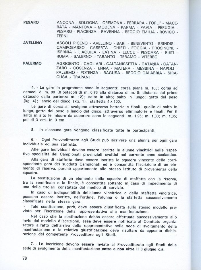 6. - Ogni Provveditorato agli Studi può iscrivere una alunna per ogni gara individuale ed una staffetta.