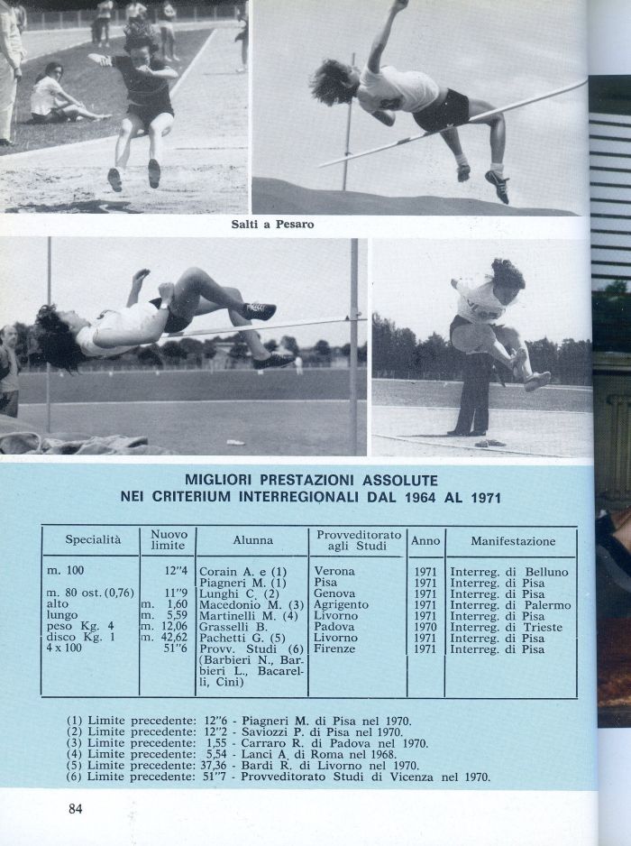 m. 100 m. 80 ost. (0,76) alto lungo peso Kg. 4 disco Kg. 1 4x 100 12'4 11 '9 m. 1,60 m. 5,59 m. 12,06 m. 42,62 51'6 Corain A. e (1) Piagneri M. (1) Lunghi C. (2) Macedonio M. (3) Martinelli M. (4) Grasselli B. Pachetti G. (5) Provv. Studi (6) (Barbieri N., Barbieri L., Bacarel-li, Cini) Verona Pisa Genova Agrigento Livorno Padova Livorno Firenze 1971 1971 1971 1971 1971 1970 1971 1971 Interreg. di Belluno Interreg. di Pisa Interreg. di Pisa Interreg. di Palermo Interreg. di Pisa Interreg. di Trieste Interreg. di Pisa Interreg. di Pisa