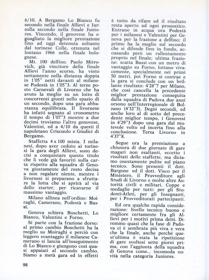 6/10. A Bergamo Lo Bianco fu secondo nella finale Allievi e Iur-zolla secondo nella finale Juniores. Vincendo, il genovese ha e-guagliato la migliore prestazione fino ad oggi detenuta soltanto dal torinese Colle, ottenuta nel lontano 1966 nella finale bolognese.