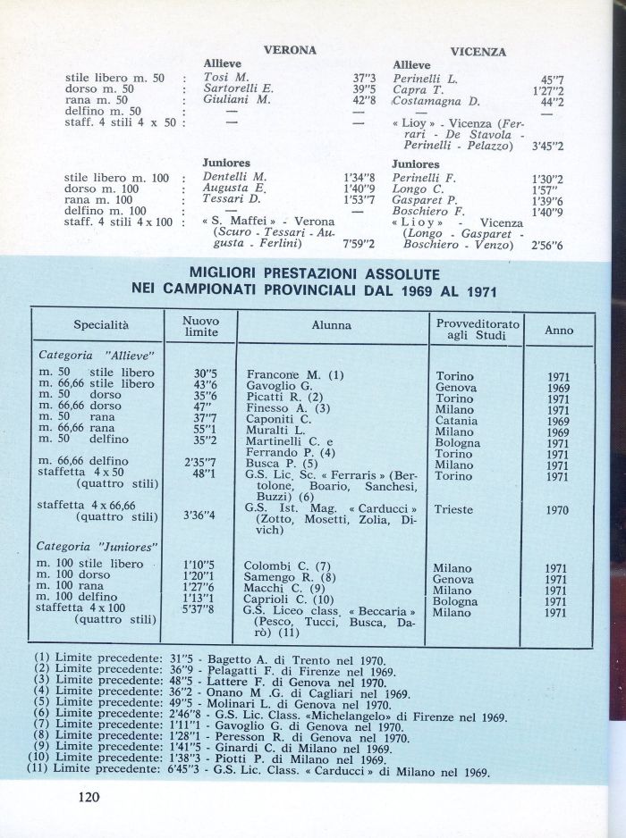 MIGLIORI PRESTAZIONI ASSOLUTE NEI CAMPIONATI PROVINCIALI DAL 1969 AL 1971