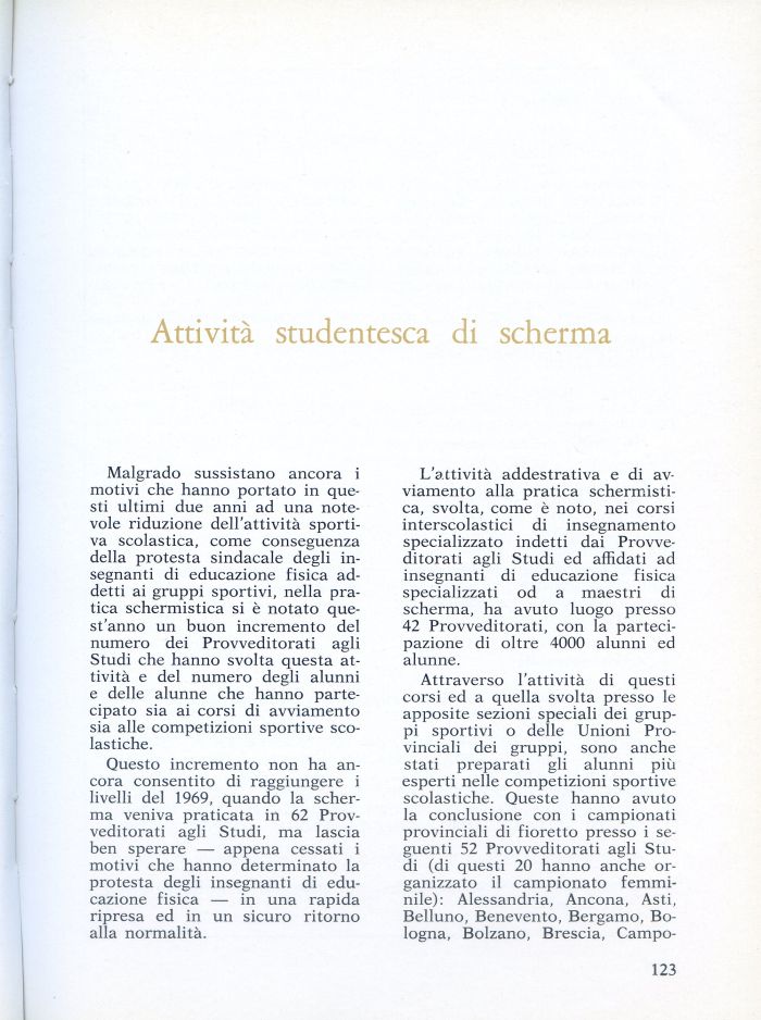 Questo incremento non ha ancora consentito di raggiungere i livelli del 1969, quando la scherma veniva praticata in 62 Provveditorati agli Studi, ma lascia ben sperare — appena cessati i motivi che hanno determinato la protesta degli insegnanti di educazione fisica — in una rapida ripresa ed in un sicuro ritorno alla normalità.