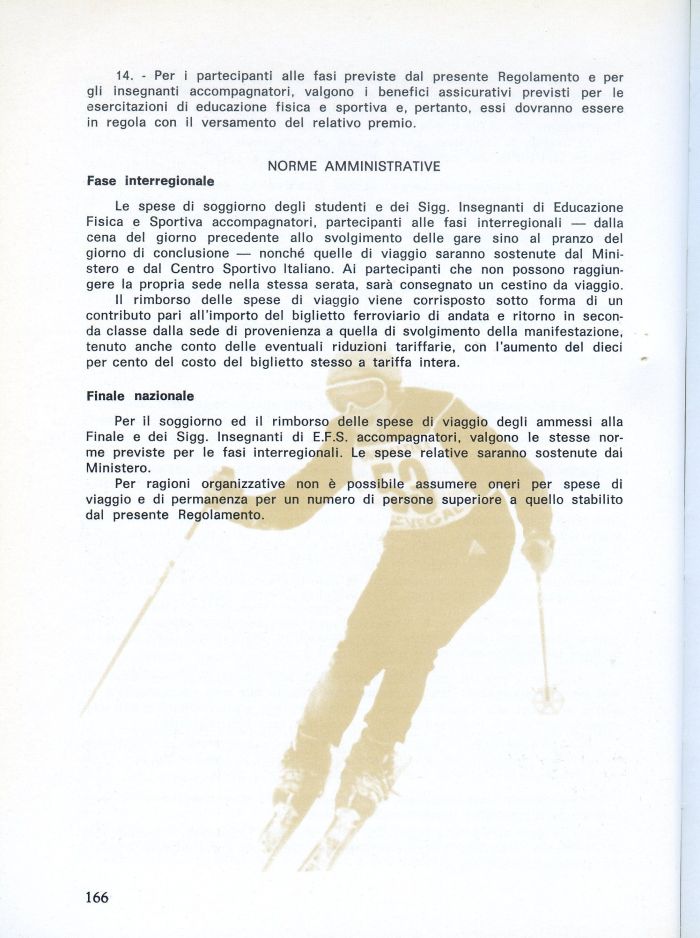 Le spese di soggiorno degli studenti e dei Sigg. Insegnanti di Educazione Fisica e Sportiva accompagnatori, partecipanti alle fasi interregionali — dalla cena del giorno precedente allo svolgimento delle gare sino al pranzo del giorno di conclusione — nonché quelle di viaggio saranno sostenute dal Ministero e dal Centro Sportivo Italiano. Ai partecipanti che non possono raggiungere la propria sede nella stessa serata, sarà consegnato un cestino da viaggio.