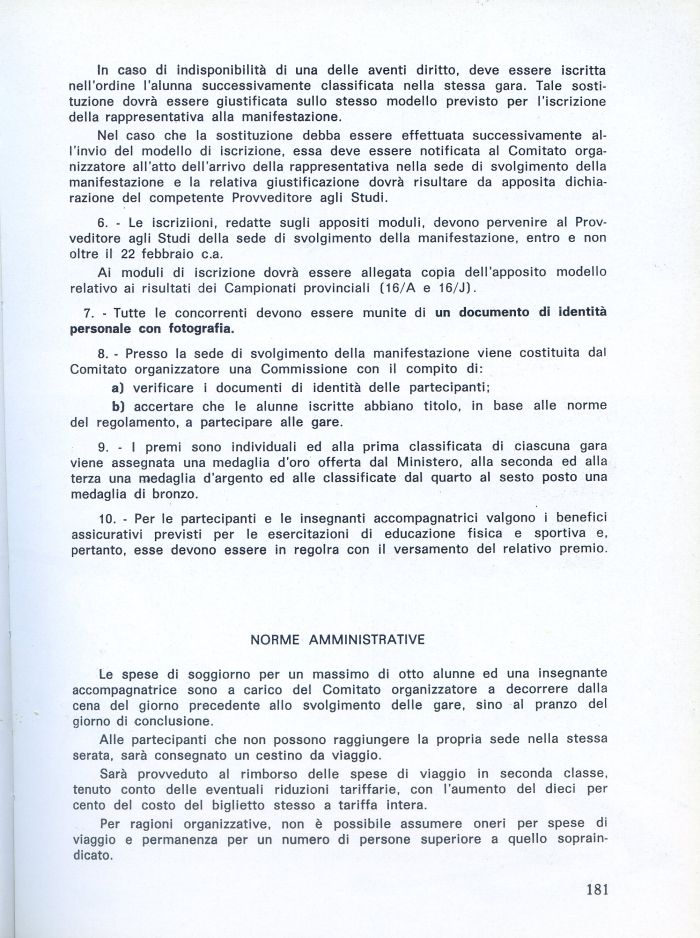 10. - Per le partecipanti e le insegnanti accompagnatrici valgono i benefici assicurativi previsti per le esercitazioni di educazione fisica e sportiva e, pertanto, esse devono essere in regolra con il versamento del relativo premio.