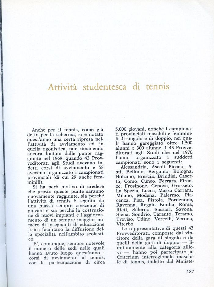 5.000 giovani, nonché i campionati provinciali maschili e femminili di singolo e di doppio, nei quali hanno gareggiato oltre 1.500 alunni e 300 alunne. I 43 Provveditorati agli Studi che nel 1970 hanno organizzato i suddetti campionati sono i seguenti: