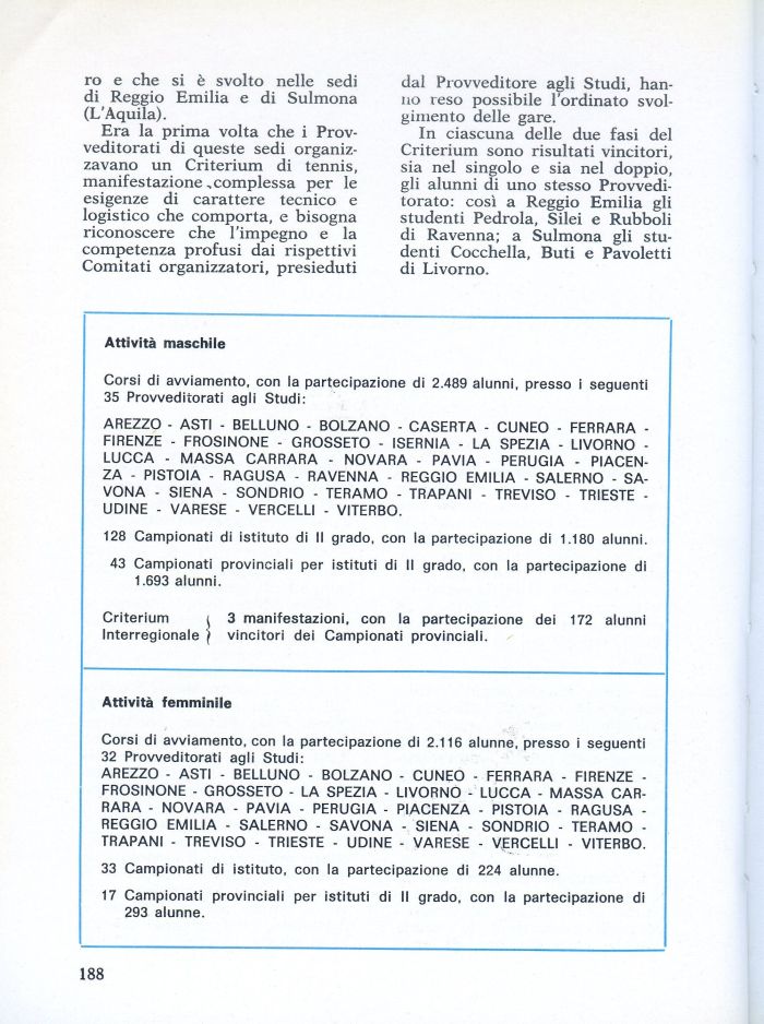 Era la prima volta che i Provveditorati di queste sedi organizzavano un Criterium di tennis, manifestazione,complessa per le esigenze di carattere tecnico e logistico che comporta, e bisogna riconoscere che l'impegno e la competenza profusi dai rispettivi Comitati organizzatori, presieduti