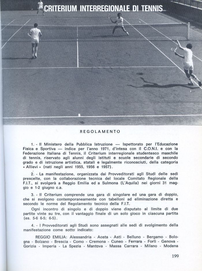 1. - Il Ministero della Pubblica Istruzione — Ispettorato per l'Educazione Fisica e Sportiva — indice per l'anno 1971, d'intesa con il C.O.N.I. e con la Federazione Italiana di Tennis, il Criterium interregionale studentesco maschile di tennis, riservato agli alunni degli istituti e scuole secondarie di secondo grado e di istruzione artistica, statali e legalmente riconosciuti, della categoria «Allievi» (nati negli anni 1955, 1956 e 1957).