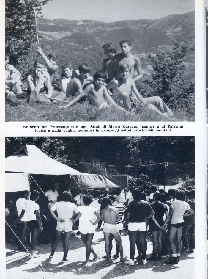 Studenti del Provveditorato agli Studi di Massa Carrara (sopra) e di Palermo (sotto e nella pagina accanto) in campeggi estivi provinciali montani.