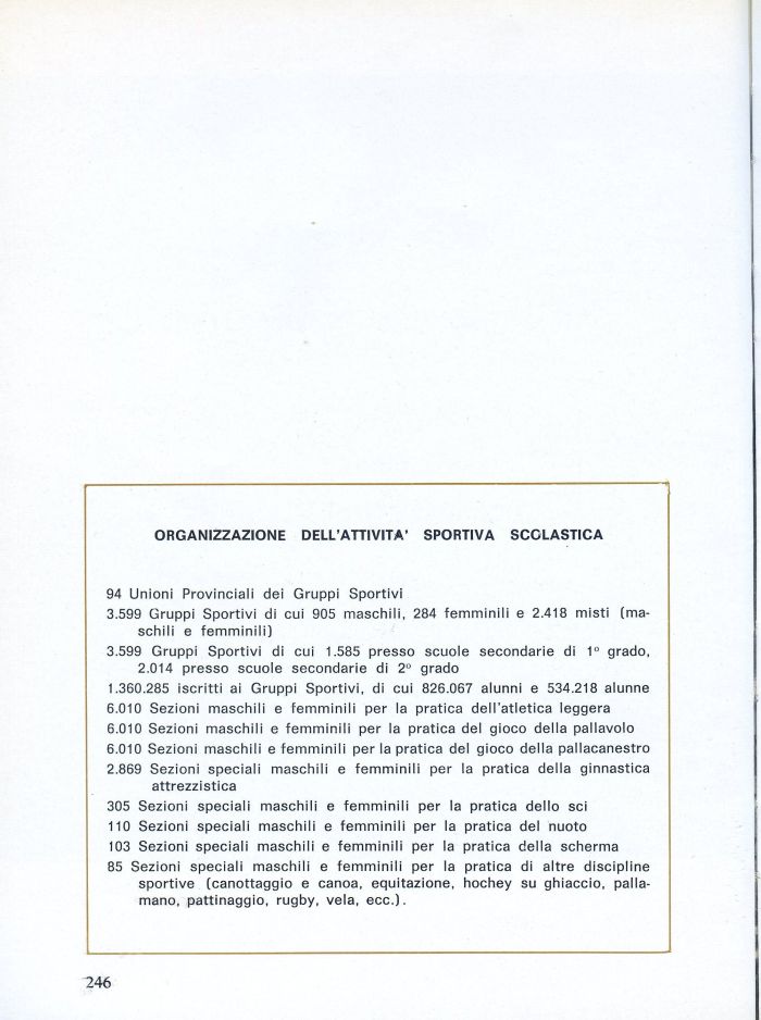 2.014 presso scuole secondarie di 2° grado 1.360.285 iscritti ai Gruppi Sportivi, di cui 826.067 alunni e 534.218 alunne 6.010 Sezioni maschili e femminili per la pratica dell'atletica leggera 6.010 Sezioni maschili e femminili per la pratica del gioco della pallavolo 6.010 Sezioni maschili e femminili per la pratica del gioco della pallacanestro 2.869 Sezioni speciali maschili e femminili per la pratica della ginnastica attrezzistica