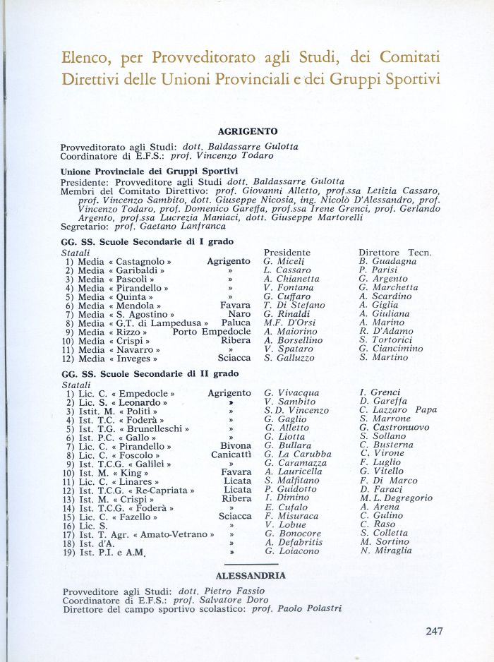 Elenco, per Provveditorato agli Studi, dei Comitati Direttivi delle Unioni Provinciali e dei Gruppi Sportivi