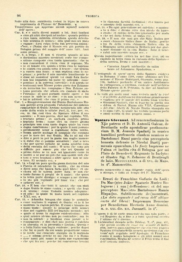 128 TEORICA Car. 14. « Legi un poco quella piena doctrina del mio » Pareia et intenderai la uerità , che za erano » diece anni che hauea facto quel libro : et an-» chora no lo uoleua porre fora: se non che » tanto furono li preghi de li amici : che quasi » la terza parte diuulgo: e sempre a me dieeua. « lo sto più vigilante per liuar via : che per » azuzere ecc. » Car. 22. « E ben che-tutti li musici che son stati » dopo Guido te siano contra: e quelli che hogi » di uiueno : come Tintoris musico adequato : » et otbi : lo quale tu tanto laudi nel capitulo » XXI. ecc. » Car. 23. « Aduncha bisogna che siano le mutatióe » come uogliono li seguaci de Guido: et. io ti ho » mostrato la ragion perche. É cussi e bisogno no » siano tante : quante lo principe del li musici » dice nel capitulo 1III del tractato secundo: nel » quale si troua la ragione euidentissima : alla » qual musico alcuno non po contradire : ma tu » non la intendi : e biastemi cum parole a te » conueniente : e dici ehel mio pareia e calciato » in absentia et in presentia e laudato. Questa e » a tutta Italia una bogia euidente : perche dapoi » che lui si parti da imi senza proportione sonno » le laude sue cresciute excepto da ti inalinolo » .....e adesso perchè tu sai che lui è a Roma » doue assai più sonno le uirtu sue cognosciute » che qui fra imi: perche ini concorrono Immilli » in ciascuna facilità doctissimi : et e tenuto per » maestro delli maestri ecc. » Car. 24. «Da ogni generatone sei calefato: e niostra-» to a dito: e dicono ecco don nicolo da lopre-» zuola : et rideno della tua ignorantia per modo » che sei facto fabula al uulgo ecc. » Car. 28. « E 11011 dir mai più che Silio Italico per » esser chiamato Italico fusse de Italia : perche » lui fu della terra chiamata Italica cita in 4 » Hispagna nella prouineia Bethica per doe gior-»Tnat.e distante da la cita Biatia: doue il uene-» rabil mio maestro inique ecc. » Questa impertinente critica ha nel fine (c;ir. 18) un capitolo in terza rima in encomio dello Spataro e della musica. Desso è così inscritt > : » Carmina Angeli michaellis (le salini benis ad Johanneni Spadarium. » L'autografo di quest'opera dello Spataro esisteva in Bologna l'anno 1509, come abbiamo nel Tri-merone d* Ercole Bottrigari, Giornata, terza pag. 11S, laddove parlando d'un antico Antifonario in cartapecora, o vitellina, esistente nell'archivio della Kabrica di S. Petronio, fa dire ad Annibale Melone questo parole : » Io volli già molti anni sono vederlo anch' io ('•ine » il predetto Antifonario) di nomitene grandemente y> voglioso per li1 parole del nostro buon vecchio » Giouanni Spataro, che si leggono in quella sua » difesa di Bartol. Ramo alla VIIJ. Correttione » del Fior, libelli di Nicolò Burtio stampata sin « lo anno 1191, la quale ho veduto (passano pochi « anni) scritta di sua propria mano. » 'lHpatii 1*0 Cniovanni. Ali reuerendissimum in Xpo patroni et D. 1). Antoniu Galeaz. de Bentiuolis sedia apostolieae prothonota-rium 13. M. Joannis Spadarij in musica li umilimi professoris eiusdem musices ac Bartolomei Rami pareie eius preceptoris lione8ta defensio in Nicolai Burtij par-meneis opusculum. ( In fine): Impresso ne Palma et inclita cita di Bologna per mi Plato de Benedeeti Regnante lo Inelyto: et illustre Sig. S. Zohanne ili Bentivogli de laiio. Moccclxxxxi. a dì xvi. de Mazo. iu 4°. Manoscritto. Questo manoscritto è una diligente copia dell' opera a stampa, e l'atta al tempo del P. Martini. - Errori de Franchino Gafurio da Lodi : Da Mae-jjstro Joane Spatario Musico Bolognese : 1 sua ,j deffen8Ìone : et del suo preceptore Mae- stro Bartolomeo Ramis Hispa-,,no. Subtilemente de-J'monstrati. (Lct data seguente è nel rerso delV ulti ma carta del libro): Impressimi Bononiae per Benedictum llectoris Anno domini. m. d. xxi. die. xn. Januarii. in 4°. L'opera è di 52 carte numerate da una sola parte, e col Registro da a lino a 0 tutti quaderni eccetto l'ultimo eli'è duerno. Il Liehtenthal dicendo nella Bibliog. T. 1°, pag. 137, • che questi) scritto fu come uu segnale ili balla-glia, poteva anco.aggiungere che con esso pagava Spataro il Gafurio 'della moneta medesima con che venn' egli regalato nell'Apologia di Franchino contro il nostro bolognese e gli altri musici suoi concittadini. Meglio ne scrisse il Ff'tis verso il line doli' articolo Gafurio.