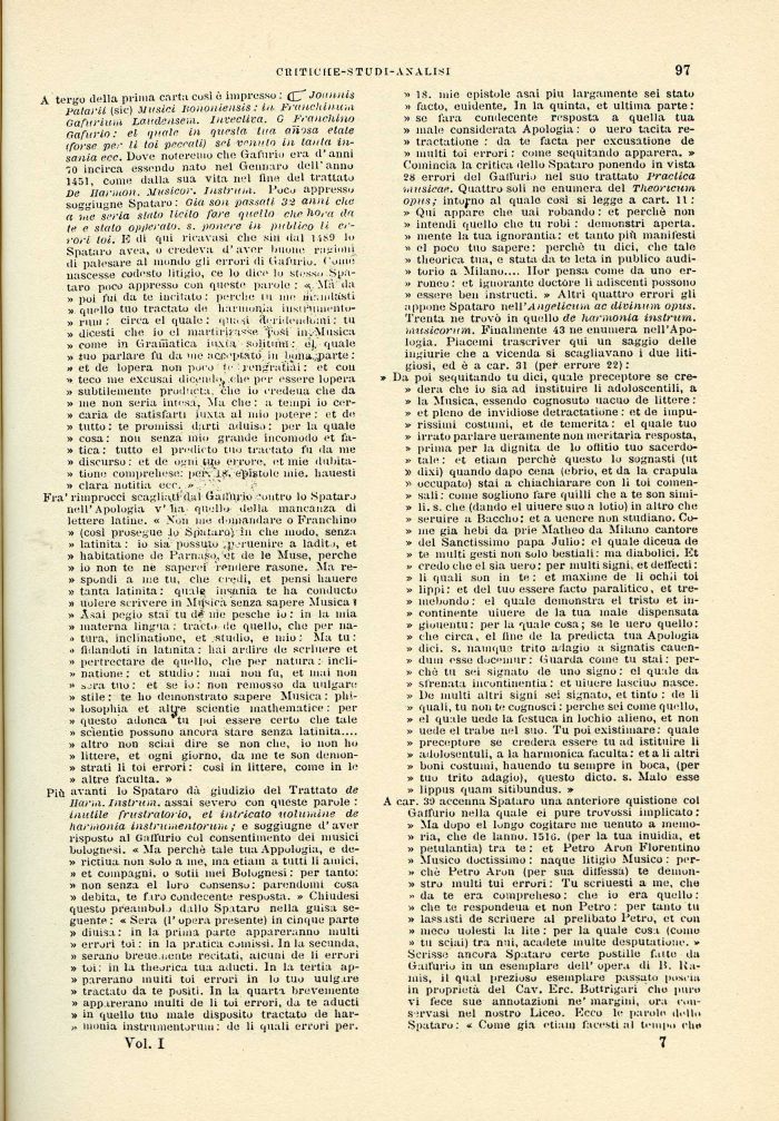 A tergo della prima carta così è impresso : (£_7* Joannis pàtarU (sic) Musici nononiensis : in, pranchinuut Gafurimu Laudensem. Invertiva. G Franchino Gafurio : el quale in questa tua ariosa etate (forse per li toi peccati) sei venuto in tanta insania ecc. Dove noteremo che Gafurio era d'anni 70 incirca essendo nato nel Gennaro dell'anno 1451, come dalla sua vita nel fine del trattato De Iiarmon. Musicar. Distrimi. Poco appresso soggi ugne Spataro: Già son passati 32 anni che a lue seria slato licito fare quello che hora da te e stalo operato, s. pone re in publico li errori toi. E di qui ricavasi che sili dal 1-iSO lo Spataro avea, o credeva d'aver buone ragioni di palesare al mondo gli errori di Gafurio. Come nascesse codesto litigio, ce lo dice lo stesso Spataro poco appresso con queste pai-ole : <<. Ma da » poi fui da te incitato: perche tu me ìicuidiisti ». quello tuo tractato de harmonia insirumento-» rum: circa el quale: qua.-ù deridendomi : tu » dicesti che io el martirii-a^se v,;osi in.Musica » come in Graiiìatica iuxia solitimi :, el. quale » tuo parlare fu da me aco'piato in boha^parte : » et de lopera non poco t< : jengVa'tiùi : et con •» teco me excusai dicendo;, .che per essere lopera » subtilemente prodi iota, che io eredeua che da » me non seria intesa. Ma che : a tempi io cer-» caria de satisfarti iuxta al mio potere : et de » tutto: te promissi darti aduiso: per la quale » cosa: non senza mio grande incomodo et fa-» tica: tutto el predicto tuo tractato fu da me » discurso : et de ognis^o errore, et mie dubita-» tione comprehese: pei\pi.8y epistole mie. hauesti » Clara notitia ecc. .» ¦ Fra'rimprocci scaglia.ti'^.al Gailitrio Contro lo Spataro nell'Apologia v'ha- quello.' della mancanza di lettere latine. « X'on me domandare o Franchino » (così prosegue lo Spataro). in che modo, senza » latinità : io sia possuto ^.jK-ruenire a ladito, et » habitatione de Parnaso., et de le Muse, perche » io non te né saperci' Vendere rasone. Ma re-» spondi a me tu, che credi, et pensi liauere » tanta latinità: quale insania te ha conducto » uolere scrivere in Mtfsicà senza sapere Musica » Asai pegio stai tu d# ine pesche io : in la mia » materna lingua : tracto de quello, che per na-.> tura, inclinatione, et .studio, e mio: Ma tu: » fidandoti in latinità: hai ardire de scrinerò et » pertrectare de quello, che per natura : incli-» natione : et studio : mai non fu, et mai non » sjra tuo : et se io : non remosso da uulgare » stile: te ho deinonstrato sapere Musica: phi-» losophia et altj-e scientie inathematice : per » questo adonca tu poi essere certo che tale