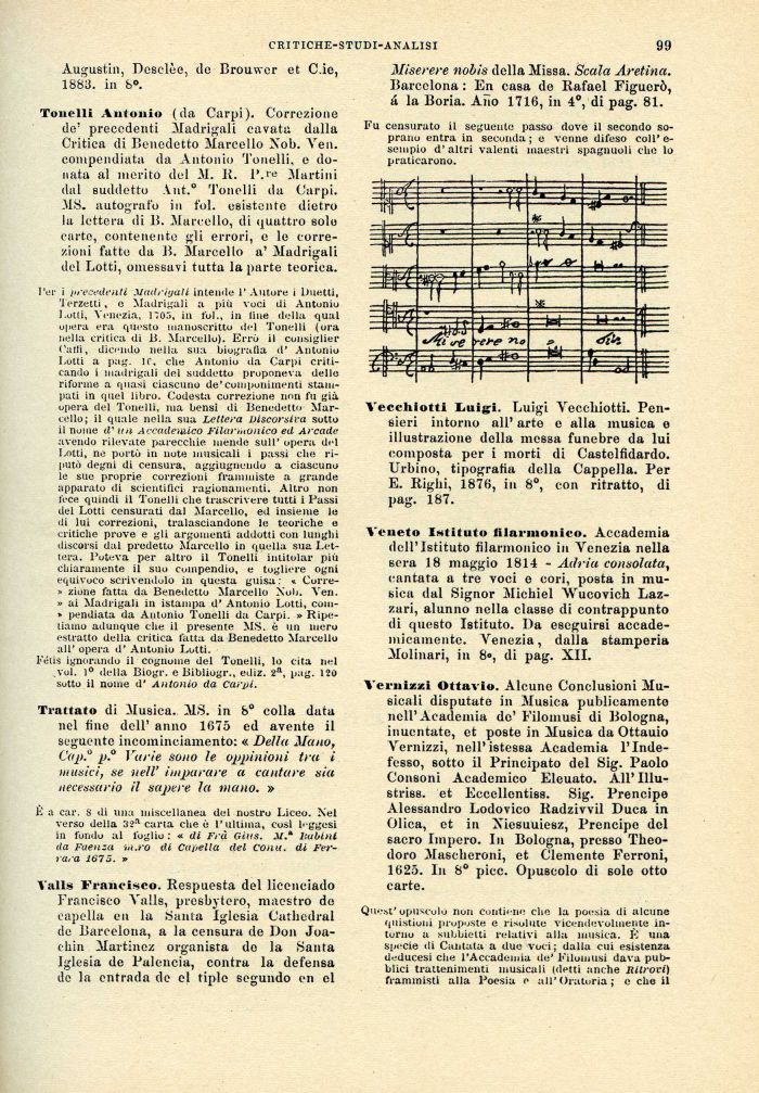 l'or i precedenti Madrinati intende 1' Autore i Duetti, Terzetti, e Madrigali a più voci di Antonio 1 .otti, Venezia, 1705, in fot., in line della qual opera era questo manoscritto del Tonelli (ora nella critica di B. Marcello). Errò il consiglier Catti, dicendo nella sua biografia d' Antonio Lotti a pag. te, che Antonio da Carpi criticando i madrigali del suddetto proponeva delle riforme a quasi ciascuno de'componimenti stampati in quel libro. Codesta correzione non fu già opera del Tonelli, ma bensì di Benedetto Marcello; il quale nella sua Lettera Discorsiva sotto il nome d1 un Accademico Filarmonico ed Arcade avendo rilevate parecchie mende sult' opera del Lotti, ne portò in note musicali i passi che riputò degni di censura, aggiugnelido a ciascuno le sue proprie correzioni frammiste a grande apparato di scientifici ragionamenti. Altro non fece quindi il Tonelli che trascrivere tutti i Passi del Lotti censurati dal Marcello, ed insieme le di lui correzioni, tralasciandone le teoriche e critiche prove e gli argomenti addotti con lunghi discorsi dal predetto Marcello in quella sua Lettera. Poteva per altro il Tonelli intitolar più chiaramente il suo compendio, e togliere ogni equivoco scrivendolo in questa guisa : * Corre-> zione fatta da Benedetto Marcello Noli. Yen. » ai Madrigali in istampa d' Antonio Lotti, com-» pendiata da Antonio Tonelli da Carpi. » Ripetiamo adunque che il presente MS. è un mero estratto della critica fatta da Benedetto Marcello all' opera d' Antonio Lotti.