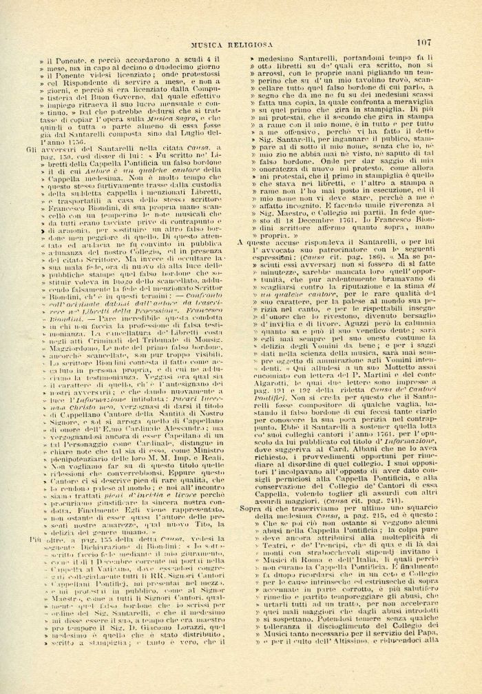 > rizia nel canto, e per le rispettabili insegne » il* onore; che lo rivestono, divenuto bersaglio » d'invidia e di livore. Aguzzi però la calunnia v quanto sa e può il suo venefico dente; ; sarà. » egli mai sempre pel suo onesto costume la '*> delizia degli Yoniini eia bene ; e per i saggi » dati nella scienza della musica, sarà mai sem-» pia; oggetto eli ammirazione, agli Yoniini inten-' denti. » Qui alludesi a un suo Mottetto assai encomiato con lettera elei P. Martini o del conte Algarotti, le quai due lettere; sono impresse a pag. 1 0 1 e; 102 della ridetta Causa de1' Cantori Pontifici. Non si creda per questo che il Santarelli fosse1 compositore eli ejualche vaglia, bastando il falso bordone ili cui foresi tante ciarle per conoscere la sua poca perizia nel contrappunto. Ebbe il Santarelli a sostener quella lotta co'suoi colleglli cantori i'anno 17G1. per 1'opuscolo da lui pubblicato col titolo el' Informazione, dove suggeriva- al Card. Albani che ne lo avevi richiesto, i provvedimenti opportuni pe;r rimediare al elisoreline di quel collegio. I suoi oppositori l'incolpavano all' eipposto eli aver dato consigli perniciosi alla Cappella Pontificia, e alla conservazione del Collegio de' Cantori eli essa Cappella, volendo toglier gli assurdi con altri assurdi maggiori. (Causa cit. pag. 2il).