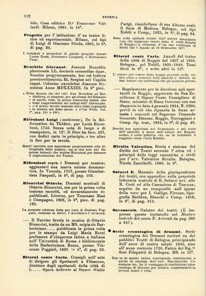 Non so se questo indice corrisponda esattamente a quello in istampa dell' avv. Maccliiavelli. Comunque sia, ha il vantaggio di racchiudere altro catalogo di drammi per musica, rappresentati in diversi teatri e citta.