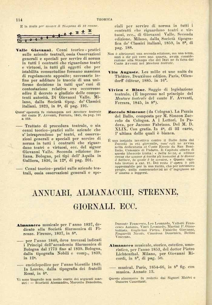 Valle Giovanili. Cenni teorico - pratici sulle aziende teatrali, ossia Osservazioni generali e speciali per servire di norma in tutti i contratti che riguardano teatri e virtuosi, in tutti gli oggetti che per istabilita consuetudine formano massima di regolamento apposito; necessarie infine per additare le traccie di una uniforme decisione in tutti que' casi di contestazione relativa ove occorresse adire il decreto o giudizio delle competenti autorità. Di Giovanni Yalle. Milano, dalla Società tipog. de' Classici italiani. 1823, in 8», di pag. 191.