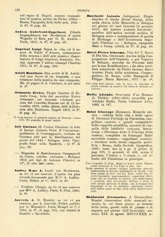 Baini Giuseppe (Romano). Memorie storico - critiche della vita e delle opero di Giovanni Pierluigi da l'alestrina, cappellano cantore, e quindi compositore della cappella pontificia, maestro di cappella delle basiliche vaticana, latera-nenso e liberiana, detto il Principe della musica ; compilata da Giuseppe Baini sacerdote romano, cappellano cantore, e direttore della stessa cappella pontificia - Roma, dalla Società tipografica, 1828; tomi due in 4 gr. il primo di pag. 376, il secondo di 439, senza il proemio, l'indice e 1' errata, e col ritratto del Palestrinu in principio.
