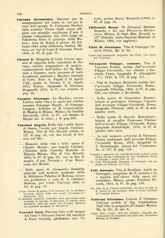 Catelani Angelo. Della vita e delle Opere di Orazio Vecchi, per Angelo Catelani. Milano, Tito di Gio. Ricordi (1858), in 12°, di pag. 56, con due tavole di musica nel fine.
