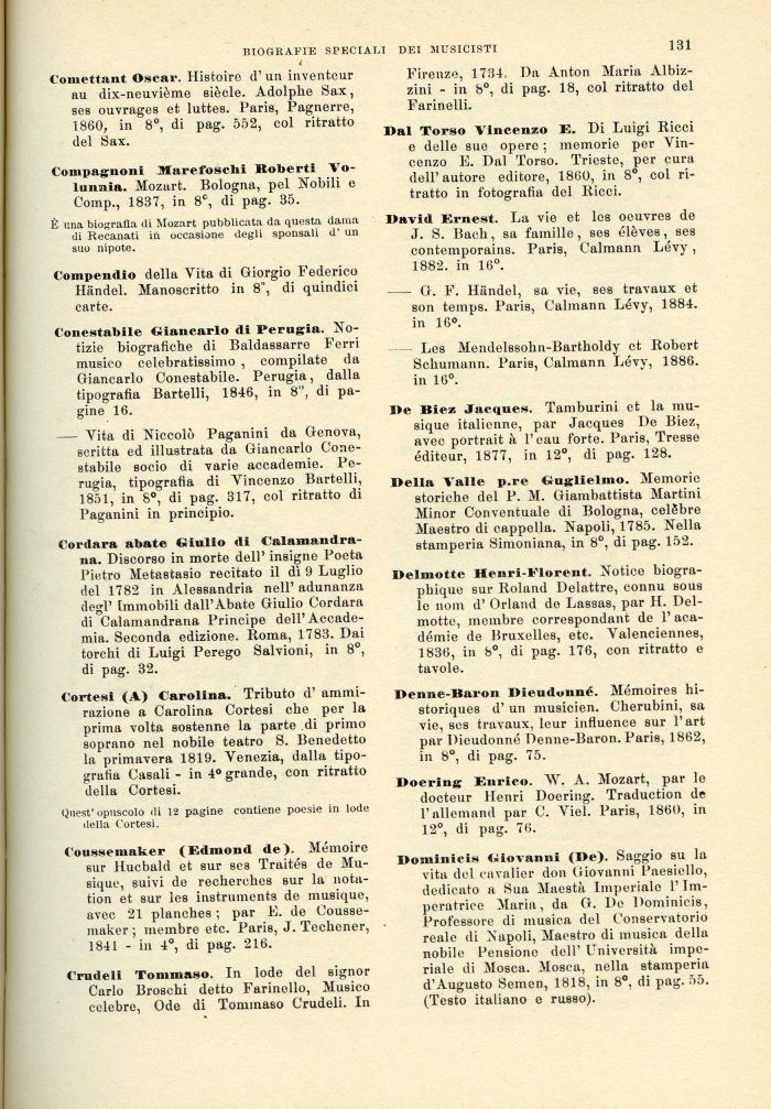 Dominicis Giovanni (De). Saggio su la vita del cavalier don Giovanni Paesiello, dedicato a Sua Maestà Imperiale l'Imperatrice Maria, da G. I)e Dominicis, Professore di musica del Conservatorio reale di Napoli, Maestro di musica della nobile Pensione dell' Università imperiale eli Mosca. Mosca, nella stamperia d'Augusto Semen, 1818, in 8°, di pag. 55. (Testo italiano e russo).