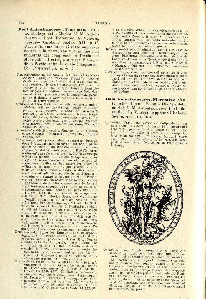 Questo è finora 1' unico esemplare completo che si conosca in Europa, contenendo tutt' e quattro le parti necessarie per eseguirne le musiche, che nessuno dei bibliografi giammai s'accorse dover esistere per render completa 1' opera. Siffatto volumetto era sepolto da secoli con altri antichi libri in un luogo riposto dell' appartamento de' conti Giuseppe ed Emanuele De' Bianchi, che venduta quella piccola ma preziosa lor libreria, dopo alcun tempo la presente opera del Doni fu comprata dal Conte Giacomo Manzoni di Lugo, che poi la cedette a^ Gaetano Gaspari per vistosissimo prezzo.