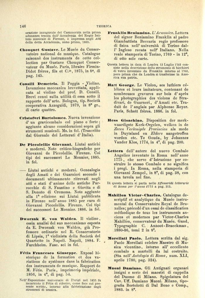 Chouquet Gustave. Le Musée du Conservatole national de musique. Catalogue raisonnè des instruments de oette col-lection par Gustave Chouquet Conser-vateur du Musée. Paris, libraire Firmin-Didot frères, file et C.'e, 1875, in 8°, di pag. 145.