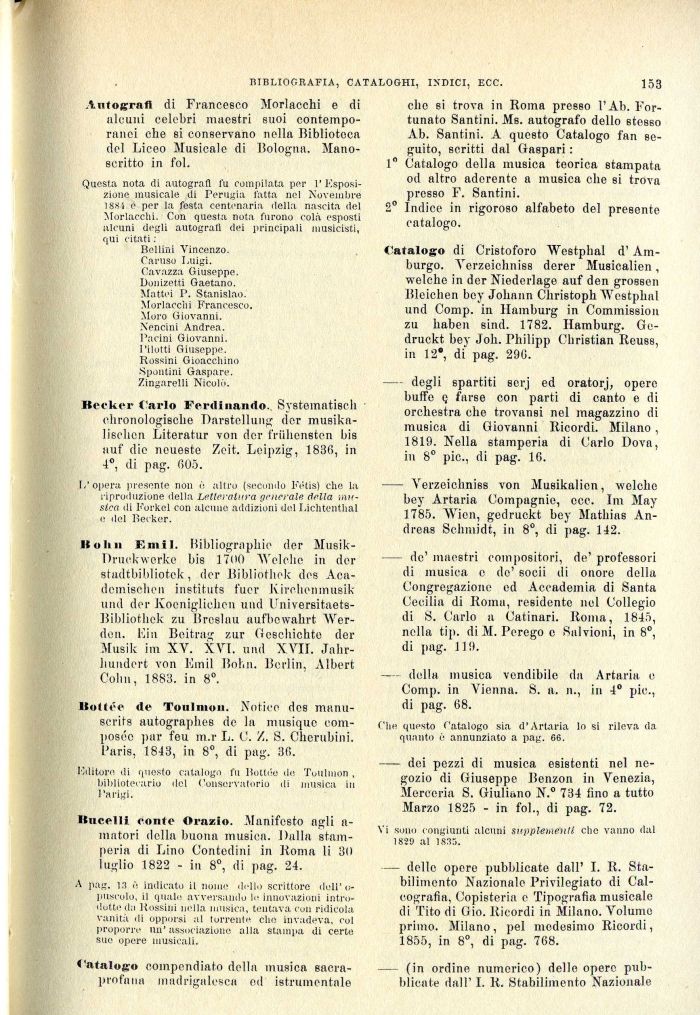 — delle opere pubblicate dall' I. R. Stabilimento Nazionale Privilegiato di Calcografia, Copisteria o Tipografia musicalo di Tito di Gio. Ricordi in Milano. Volume primo. Milano, pel medesimo Ricordi, 1855, in 8°, di pag. 768.