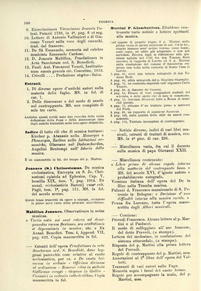 Josì appose di proprio pugno il p. Martini nella prima carta di questo zibaldone di car. 118 in fol., riunite insieme senz' ordine veruno come bozzo, male copie, ed altro già adoperato e non più servibile. Diversi fogli si riferiscono alla qui-stione agitata nel 1733 fra don Tomaso Redi maestro ili cappella di Loreto ed il p. Martini sulla risoluzione del canone d' Animuceia esistente una volta nella cantoria di Santa Casa di Loreto.