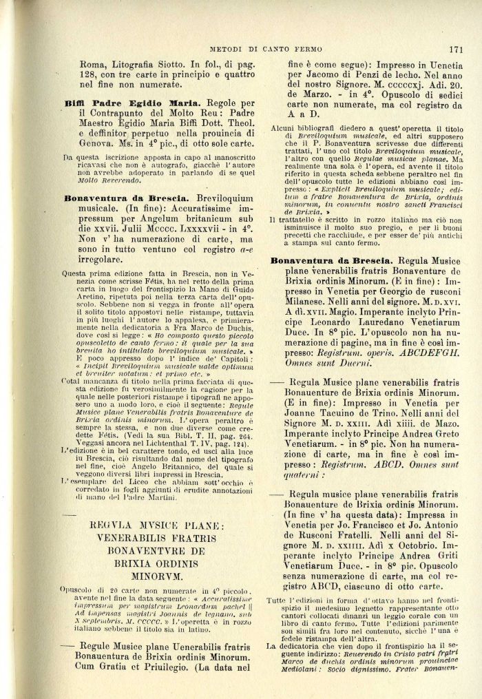 Cotal mancanza di titolo nella prima facciata di questa edizione fu verosimilmente la cagione per la quale nelle posteriori ristampe i tipografi ne apposero uno a modo loro, e cioè il seguente: Regulc Musice piane venerabilis fratris Bonaventurc de Brixia ordinis minorum. L'opera peraltro è sempre la stessa, e non due diverse come credette Fdtis. (Vedi la sua Iìibl. T. II, pag. 204. Veggasi ancora nel Lichtenthal T. IV, pag. 124).