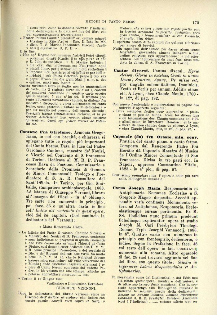 Cantone Fra Girolamo, Armonia Gregoriana, in cui con breuità, e chiarezza si spiegano tutte le regole più importanti del Canto Fermo, Data in luce dal Padre Gerolamo Cantone, maestro de' Nouizi, e Vicario nel Conuento di S. Francesco di Torino. Dedicata al M. R. P. Francesco Bava da Fossano. Commissario e Secretarlo della Prouincia di Genoua de' Minori Conuentuali, Teologo e Predicatore di S. A. R. Consultore del Sant' Officio. In Torino, per Gio. Sini-baldo, stampatore archiepiscopale, 1668. Ad istanza di Giuseppe Vernoni, libraro all' insegna del Giesù - in 4° oblungo. Tre carte non numerato in principio, poi facc. 36 e un' altra carta in fine coli' Indice del contenuto in quest'opera, cioè dei 24 capitoli. (Cosi comincia la dedicatoria del Vernoni) :