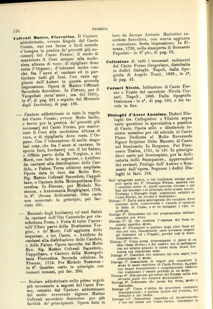 Coferati Matteo, Fiorentino. Il Cantore addottrinato, ovvero Regole del Canto Corale, oue con breuo e facil metodo s'insegna la pratica de'precotti più ne-cessarj del Canto Ferino; il modo di mantenere il Coro sempro alla medesima altezza di voce; di ripigliare doue resta 1' Organo ; d'intonare molte coso che fra 1' anno si cantano ed in particolare tutti gli Inni. Con varie aggiunte dell' Autore in questa seconda impressione. Opera di Matteo Crferati Sacerdote fiorentino. In Firenze, per il Vangelisti (senz'anno, ma del 1691), in 8°, di pag. 391 e seguito dal Manuale degli Invitatorj, di pag. 196.