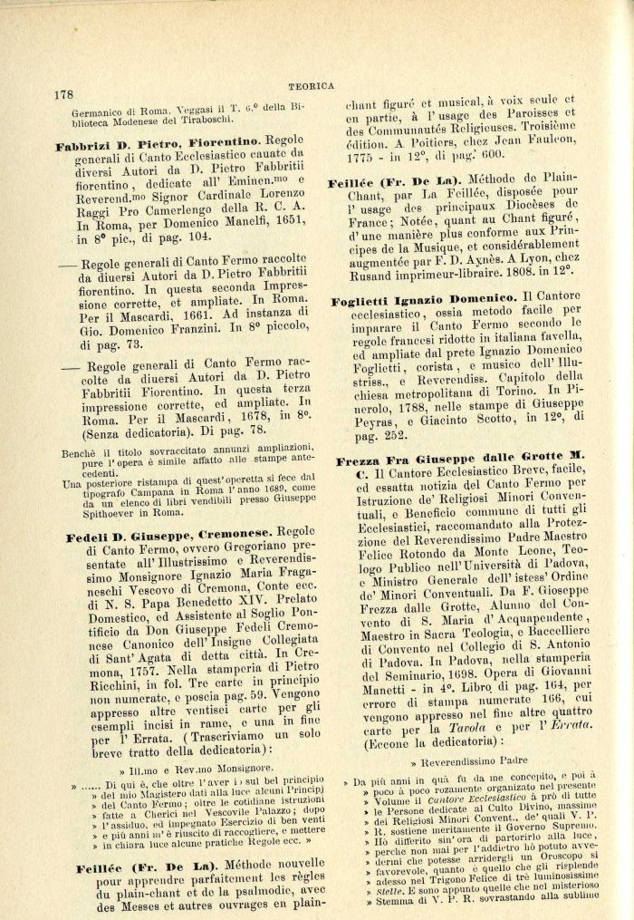Fedeli I». Giuseppe, Cremonese. Regolo di Canto Fermo, ovvero Gregoriano presentate all' Illustrissimo e Reverendissimo Monsignore Ignazio Maria Fraga-nesebi Vescovo di Cremona, Conto ecc. di N. S. Papa Benedetto XIV. Prelato Domestico, ed Assistente al Soglio Pontificio da Don Giuseppe Fedeli Cremonese Canonico dell' Insigne Collegiata di Sant' Agata di dotta città. In Cremona, 1757. Nella stamperia di Pietro Ricchini, in fol. Tre carte in principio non numerate, e poscia pag. 59. Vengono appresso altre ventisei carte per gli esempli incisi in rame, e una in fine per 1' Errata. ( Trascriviamo un solo breve tratto della dedicatoria) :