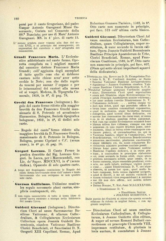 Guidetti Giovanni. Di'rectorium Chori Ad vsum omnium Ecclesiarum, tam Cathe-dralium, quam Collegiatarum, nuper re-stitutum, & nunc secundo in lucem edi-tum. Opera Joannis Guidetti Bononiensis Basilicae Principis Apostolorum de Urbe, Clerici Beneficiati. Bomae, apud Fran-ciscum Coattinum, 1589, in 8°. Otto carte non numerate in principio, poi face. 607. (Diam qui sotto alcuni importanti squarci della dedicatoria).