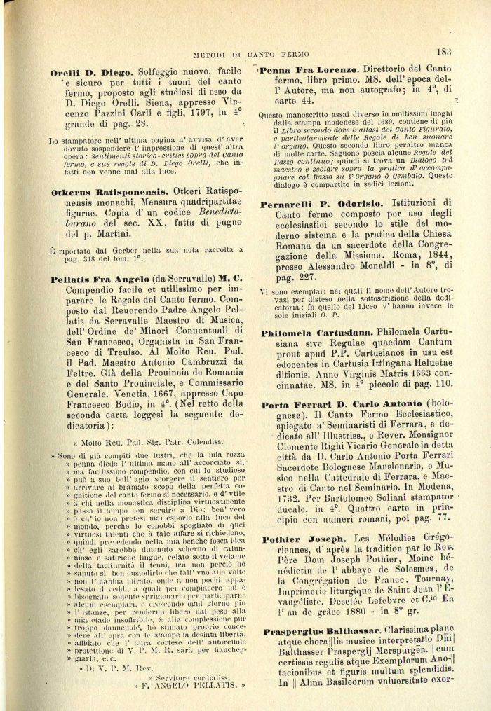 Pellatis Fra Angelo (da Serravalle) M. C. Compendio facile et utilissimo per imparare le Regole del Canto formo. Composto dal Reuerendo Padre Angelo Pellatis da Serravalle Maestro di Musica, dell' Ordino de' Minori Conuentuali di San Francesco, Organista in San Francesco di Treuiso. Al Molto Reu. Pad. il Pad. Maestro Antonio Cambruzzi da Feltre. Già della Prouincia de Romania e del Santo Prouinciale, e Commissario Generale. Venetia, 1667, appresso Capo Francesco Bodio, in 4°. (Nel retto della seconda carta loggesi la seguente dedicatoria):