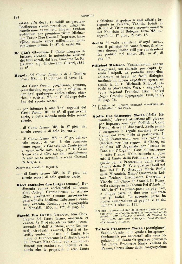 - di Canto fermo. MS. in 8° gr. del secolo scorso, di car. 15 che comincia come segue : « Che cosa sia Canto fermo e nome delle note. Cap. I.' Il Canto fermo non è altro che una modulatione di voce senza armonia e senza diversità di tempo. »