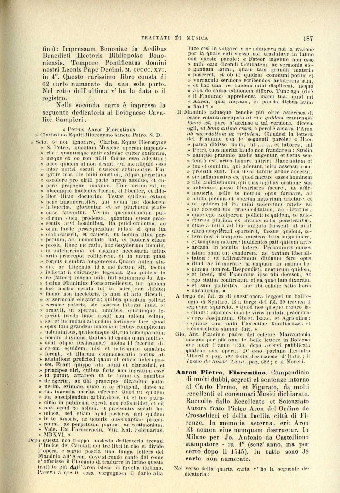 Aaron Pietro, Fiorentino. Compendiolo di molti dubbi, segreti et sentenze intorno al Canto Fermo, et Figurato, da molti eccellenti et consumati Musici dichiarato. Raccolte dallo Eccellente et Scienziato Autore frate Pietro Aron del Ordine de Oosachicri et della Inclita città di Firenze. In memoria aeterna, erit Aron Et nomen eius nuniquam destruetur. In Milano per Jo. Antonio da Castelliono stampatore - in 4° (senz' anno, ma per certo dopo il 1545). In tutto sono 38 carte non numerate.