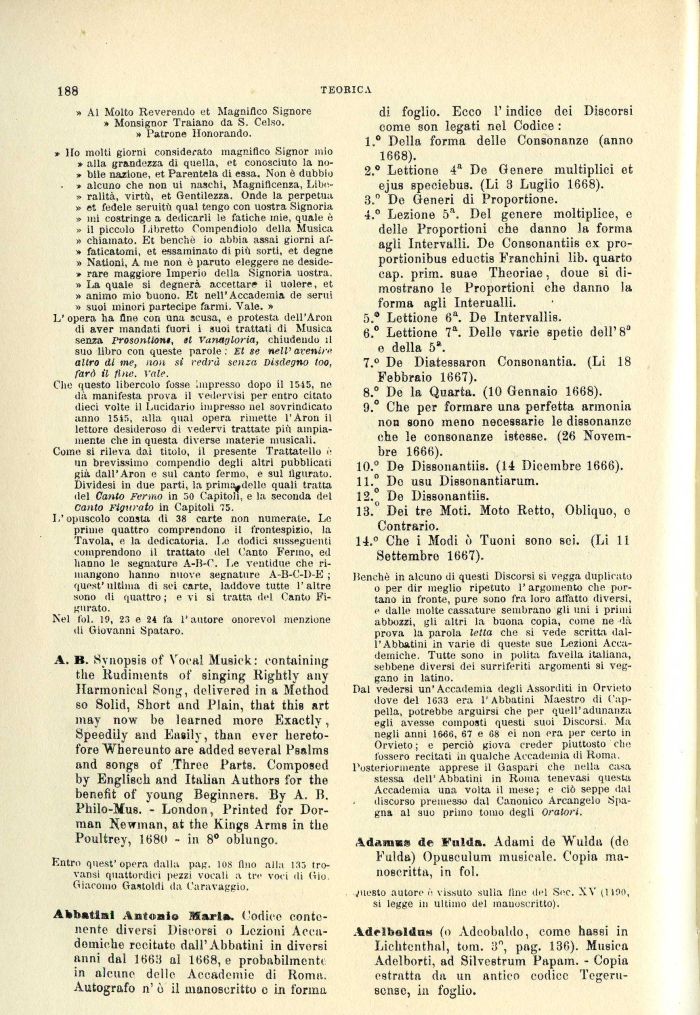 * Ilo molti giorni considerato magnifico Signor mio » alla grandezza di quella, et conosciuto la no-» bile Razione, et Parentela di essa. Non è dubbio ¦ » alcuno che non ui nascili. Magnificenza, Libe-» ralità, virtù, et Gentilezza. Onde la perpetua » et fedele seruitù qual tengo con uostra Signoria » mi costringe a dedicarli le fatiche mie, quale è » il piccolo Libretto Compendiolo della Musica » chiamato. Et benché io abbia assai giorni af-w faticatomi, et essaminato di più sorti, et degne » Nationi, A me non è parato eleggere ne deside-» rare maggiore Imperio della Signoria uostra. » La quale si degnerà accettare ii uolere, et » animo mio buono. Et nell'Accademia de serui » suoi minori partecipe farmi. Vale. »