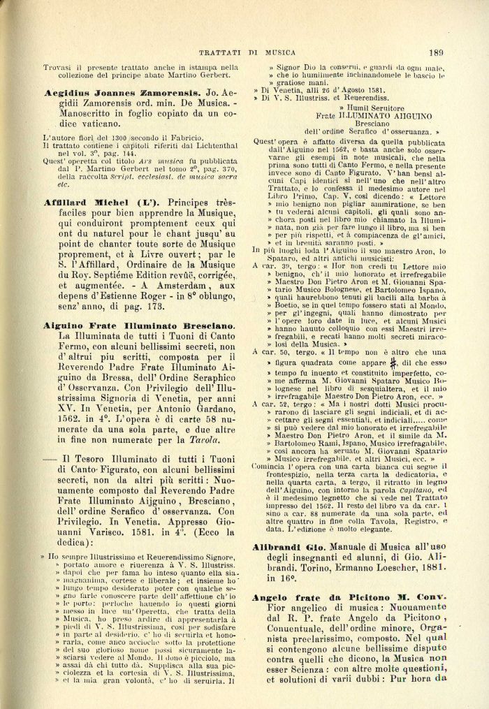 — Il Tesoro Illuminato di tutti i Tuoni di Canto- Figurato, con alcuni bellissimi secreti, non da altri più scritti : Nuo-uamente composto dal Reverendo Padre Frate Illuminato Aijguino , Bresciano , dell' ordine Serafico d' osservanza. Con Privilegio. In Venetia. Appresso Oio-uanni Varisco. 1581. in 4'. (Ecco la dedica):