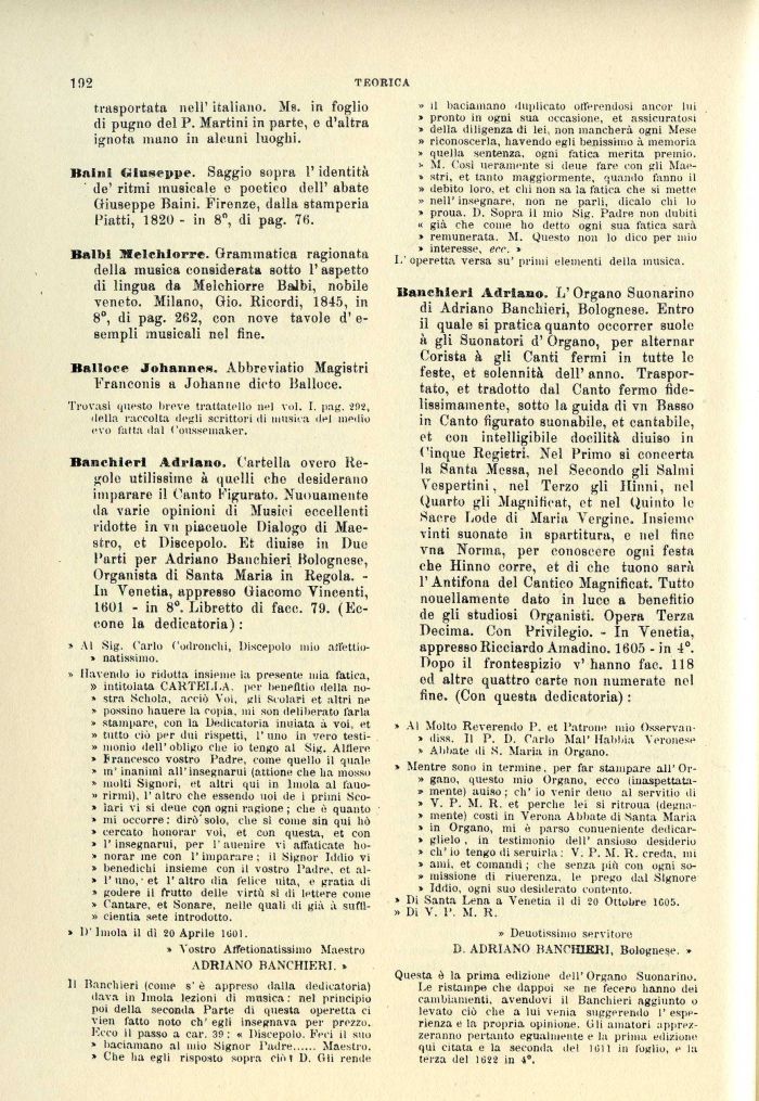 Banchieri Adriano. Cartella overo Regole utilissime à quelli che desiderano imparare il Canto Figurato. Nuouaineute da varie opinioni di Musici eccellenti ridotte in vii piaceuole Dialogo di Maestro, et Discepolo. Et diuise in Due l'urti per Adriano Banchieri Bolognese, Organista di Santa Maria in Regola. -In Venetia, appresso Giacomo Vincenti, 1601 - in 8°. Libretto di face. 79. (Eccone la dedicatoria):