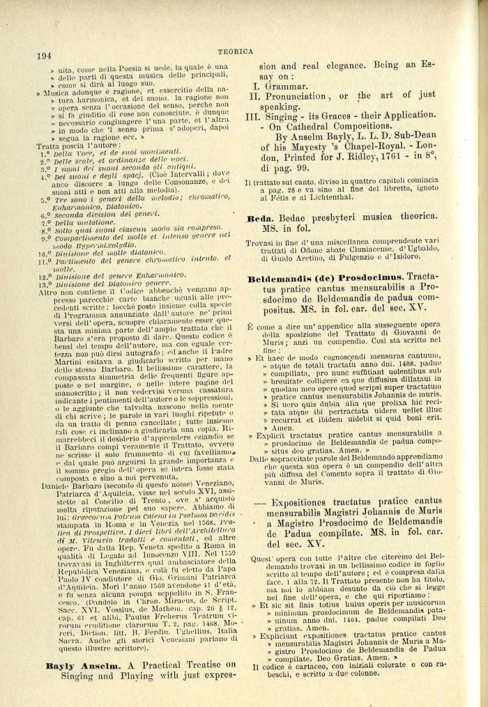 Il trattato sul canto, diviso in quattro capitoli comincia a pag. 28 e va sino al fine del libretto, ignoto al Fétis e al Lichtenthal.