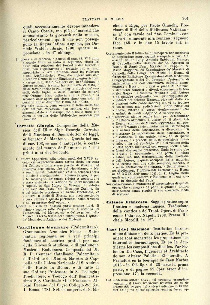 Catalisaii» Gennaro (Palermitano). Grammatica Armonica Fisico - Matematica ragionata su i veri principj fondamentali teorico - pratici per uso della Gioventù studiosa, e di qualunque Musicale Radunanza. Composta dal M. R. P. Gennaro Catalisano Palermitano dell' Ordine dei Minimi, Maestro di Cappella della Chiesa Nazionale di S. Andrea delle Fratte in Roma, e di tutto il suo Ordine; Professore in S. Teologia; Predicatore, e Teologo dell' Eminentis-simo Sig. Cardinale Gio: Francesco Albani Decano del Sagro Collegio &<:. &c. In Roma, 1781. Nella stamperia di S. Mi-