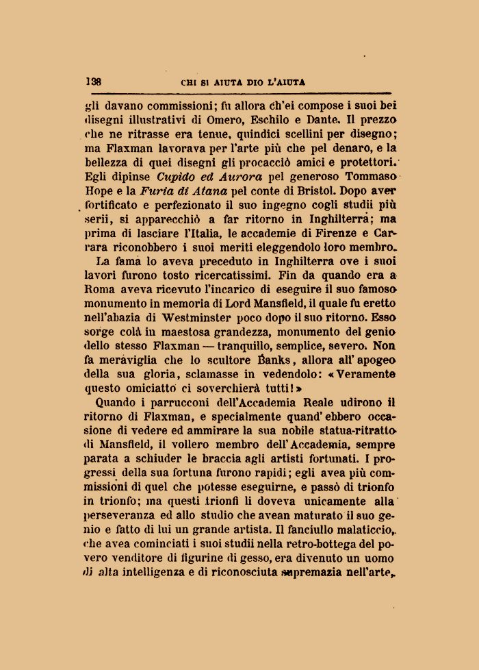 Quando i parrucconi dell'Accademia Reale udirono il ritorno di Flaxman, e specialmente quand'ebbero occasione di vedere ed ammirare la sua nobile statua-ritratto di Mansfield, il vollero membro dell'Accademia, sempre parata a schiuder le braccia agli artisti fortunati. I progressi della sua fortuna furono rapidi ; egli avea più commissioni di quel che potesse eseguirne, e passò di trionfo in trionfo; ina questi trionfi li doveva unicamente alla perseveranza ed allo studio che avean maturato il suo genio e fatto di lui un grande artista. Il fanciullo malaticcio,, che avea cominciati i suoi studii nella retro-bottega del povero venditore di figurine di gesso, era divenuto un uomo i)i alta intelligenza e di riconosciuta .supremazia nell'arte,.