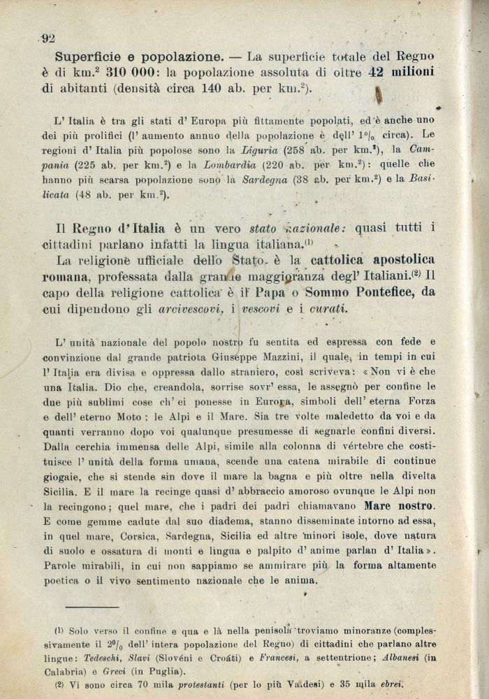 (1) Solo verso il confine e qua e là nella penisola 'troviamo minoranze (complessivamente il 2°/0 dell' intera popolazione del Regno) di cittadini che parlano altre lingue: Tedeschi, Slavi (Slovèni e Croàti) e Francesi, a settentrione; Albanesi (in Calabria) e Greci (in Puglia).