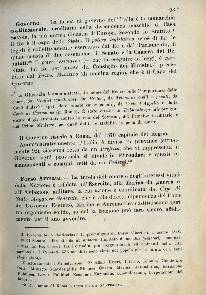Governo. — La forma di governo dell' Italia è la monarchia costituzionale, ereditaria nella discendenza maschile di Casa Savoia, la più antica dinastia d' Europa. Secondo lo Statuto (,) il Re è il capo dello Stato. Il potere legislativo (cioè di far le leggi) è collettivamente esercitato dal Re e dal Parlamento, il quale consta di due assemblee: il Senato e la Camera dei Deputati.® U potere esecutivo (= che fa eseguire le leggi) è esercitato dal Re per mezzo del Consiglio dei Ministri,® presieduto dal Primo Ministro (di nomina regia), che è il Capo del Governo.