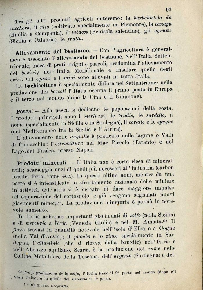 In Italia abbiamo importanti giacimenti di zolfo (nella Sicilia) e di mercurio a ìdria (Venezia Giulia) e nel M. Amiata.'» Il ferro trovasi in quantità notevole nell' isola d' Elba e a Cogne (nella Val d'Aosta); il piombo e lo zinco specialmente in Sardegna, l'alluminio (che si ricava dalla bauxite) nell' Istria e nell' Abruzzo aquilano. Scarsa è la produzione del rame nelle Colline Metallifere della Toscana, dell' argento (Sardegna) e del-